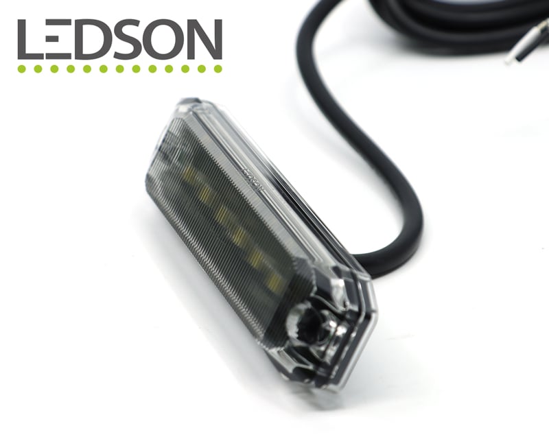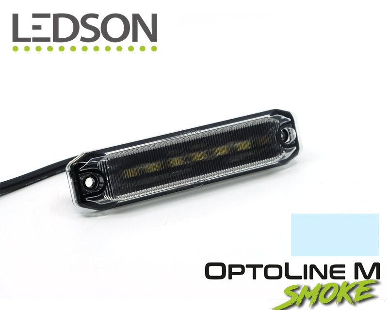 The Ledson Optoline M is a position light and side marker with a smoke lens. It features 6 LEDs and uses Fiber Optic technology. This light is easy to install and operates on a voltage of 9-32V. It complies with the ECE R148 standard and has an IP67 waterproof rating. Benefits include the durable construction and stylish appearance. Dimensions and details: compact design, suitable for various vehicles.