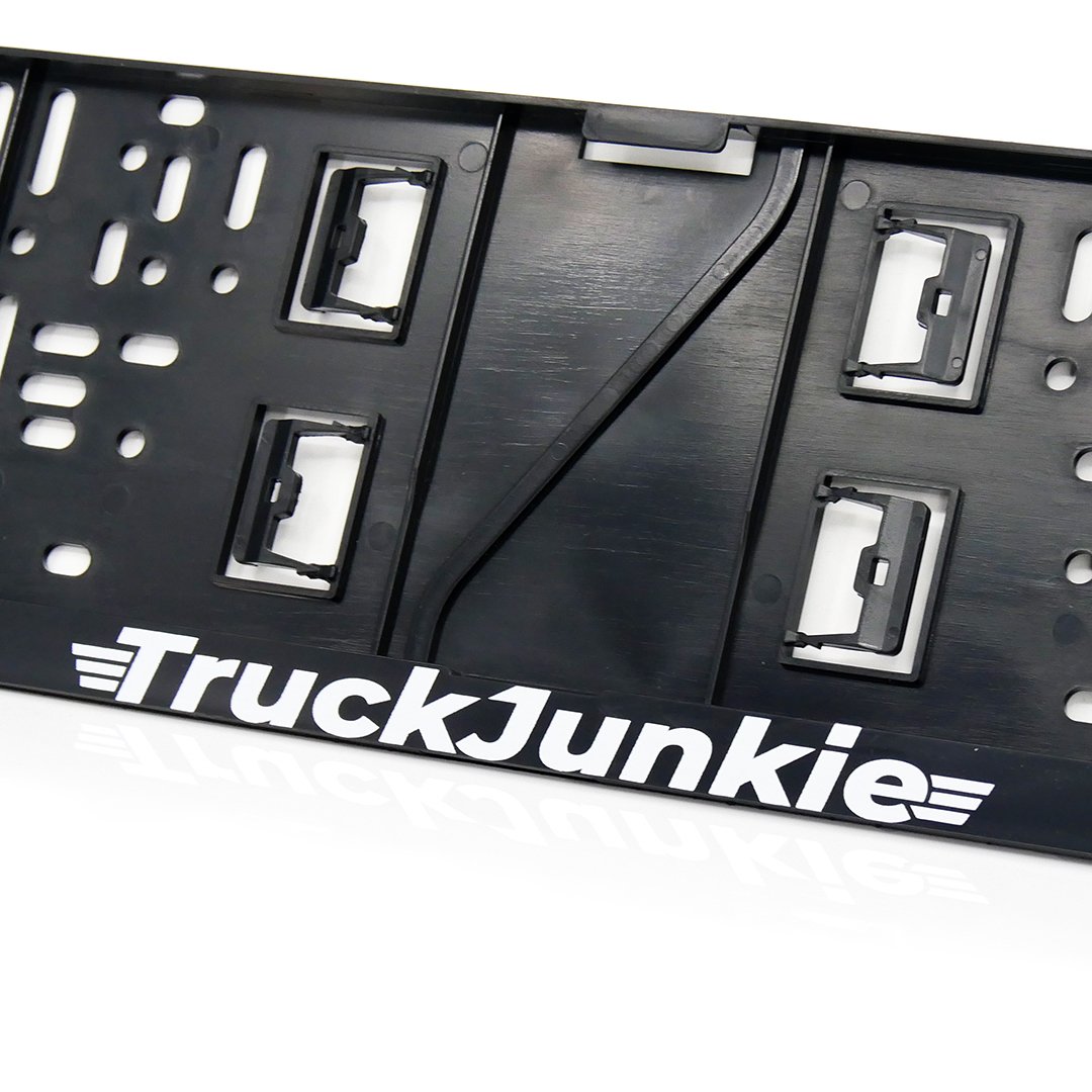 Discover the sturdy and stylish Truckjunkie license plate holder with black-and-white print. This holder is made from high-quality ABS plastic, ensuring a long lifespan and excellent resistance to weather conditions.