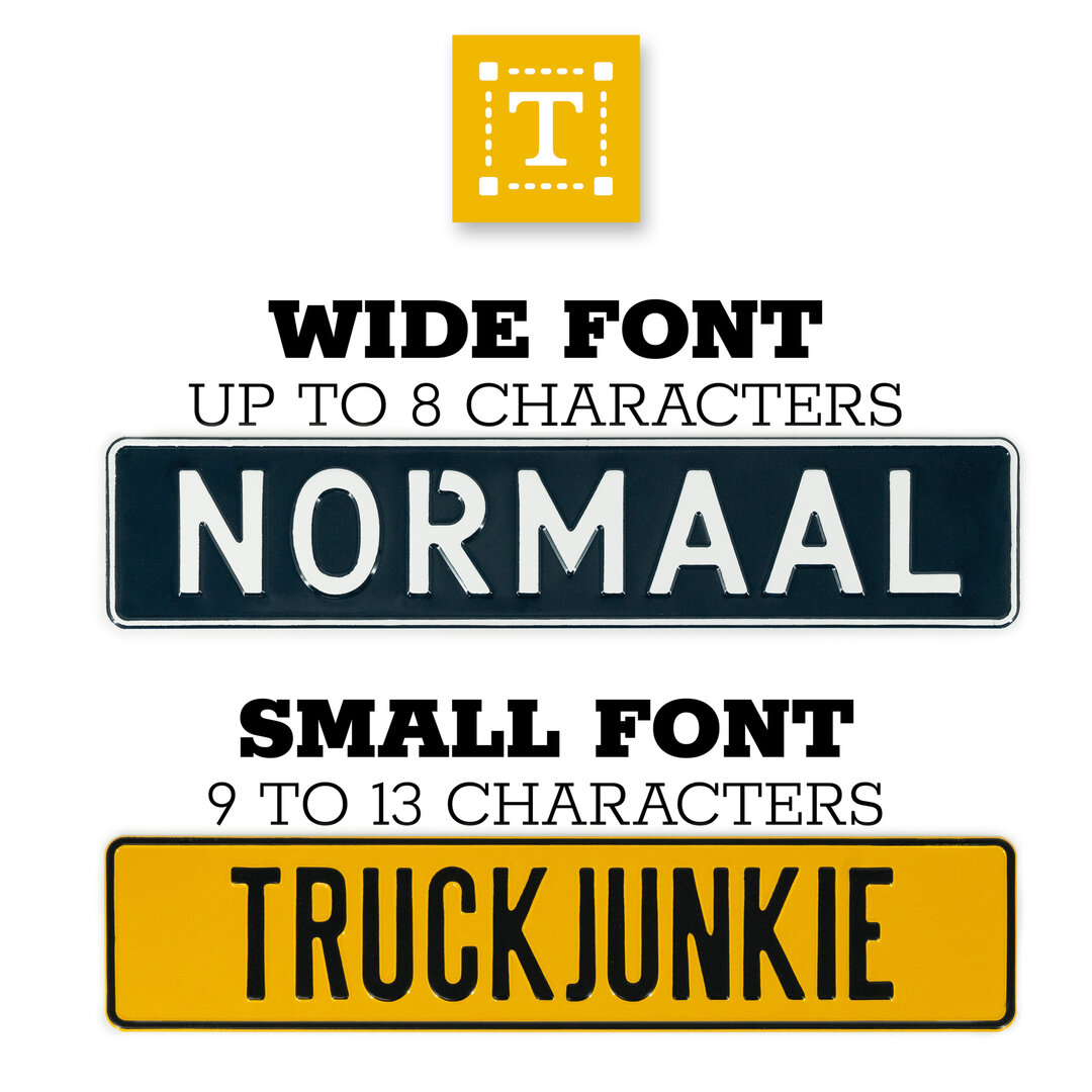 - De naam of tekst op de kentekenplaat wordt nauwkeurig uitgelijnd, waardoor links en rechts van de tekst een evengrote lege ruimte ontstaat.