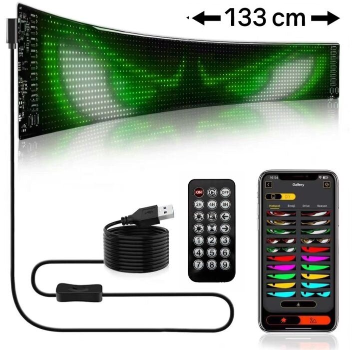 De 133cm versie van het Matrix Devil Eyes panel. Ideaal voor middelgrote voorruiten. Volledig programmeerbaar: tekst, graphics, animaties. RGB LED's voor elke kleur die je wilt. Flexibel design past op gebogen oppervlakken. Jouw boodschap, jouw stijl.